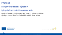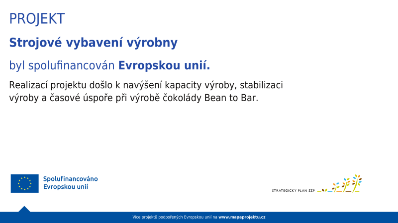 Projekt „Strojové vybavení výrobny“ čokoládovny Bean to Bar umožnil naší firmě navýšení kapacity výroby, její stabilizaci a časovou úsporu. Projekt byl realizován v rámci Strategického plánu Společné zemědělské politiky, prostřednictvím strategie Komunitně vedeného místního rozvoje MAS Lanškrounsko.
